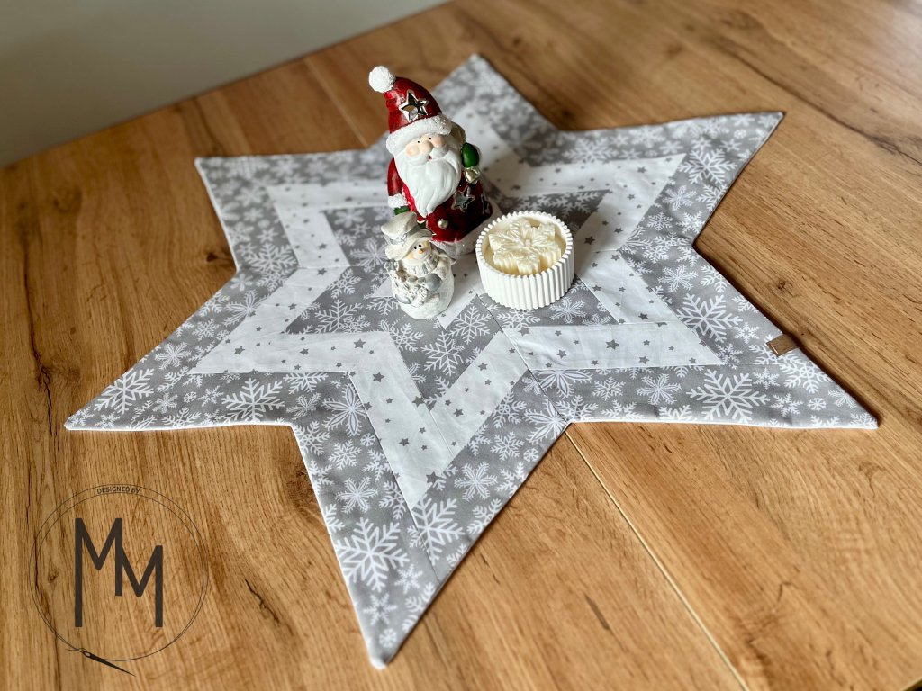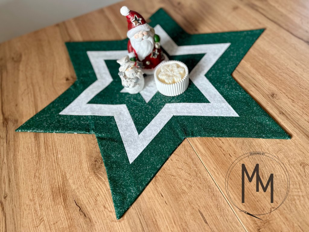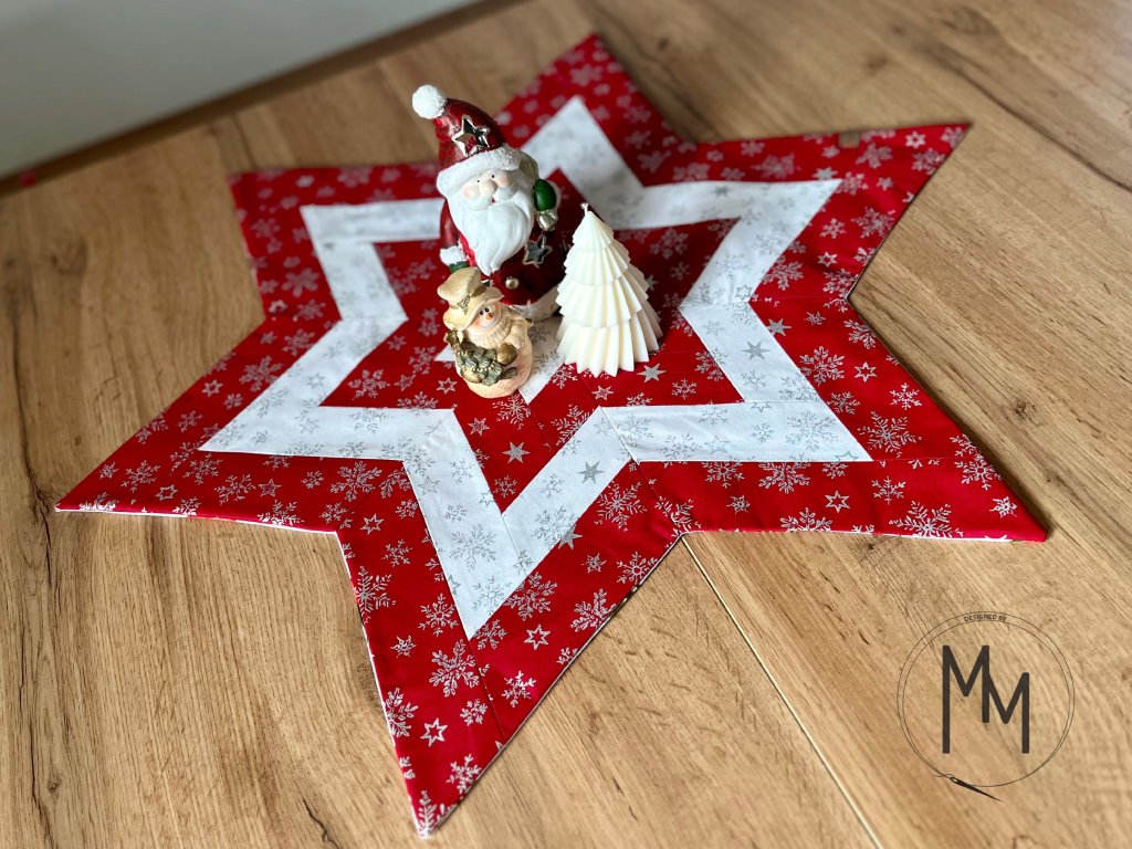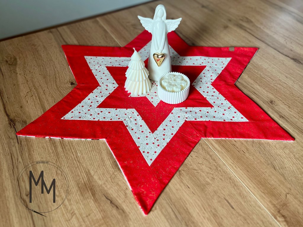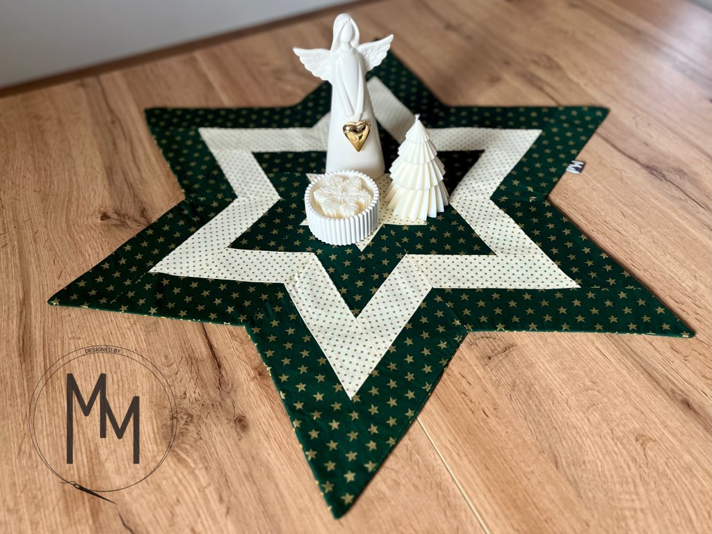 Originální vánoční ubrus ve tvaru hvězdy o velikosti cca 70cm, pečlivě ušitý složitou technikou patchwork. Tato ručně ušitá dekorace krásně ozdobí střed vašeho stolu a vnese do domova teplo a kouzlo Vánoc. Hvězdy šijeme z kvalitních českých látek.